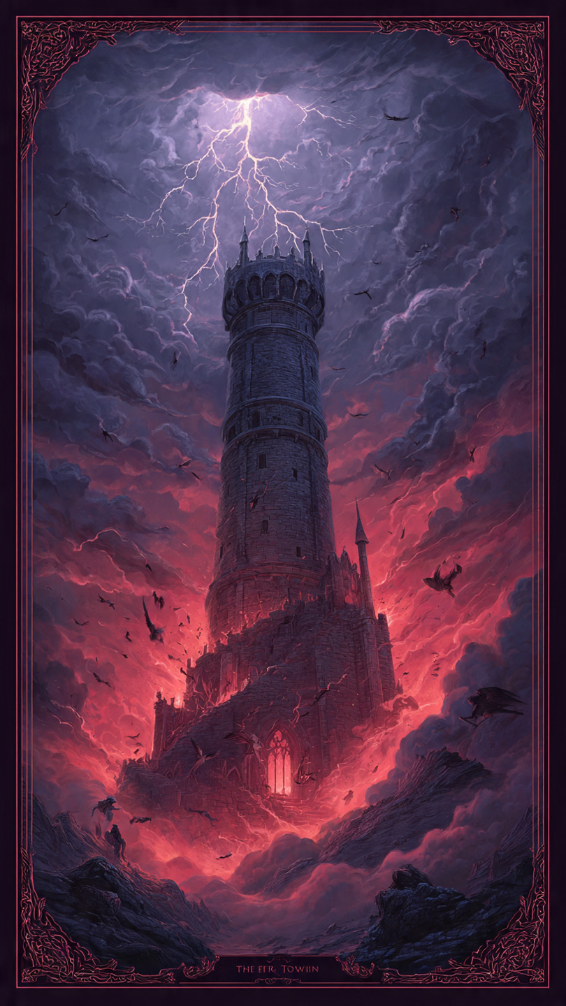 *Co karta říká:* Věž je zbořená bleskem. Staré padá, aby mohlo vzniknout nové. Tento týden přijde nečekaná změna. Něco, na co jste spoléhali, se otřese v základech.